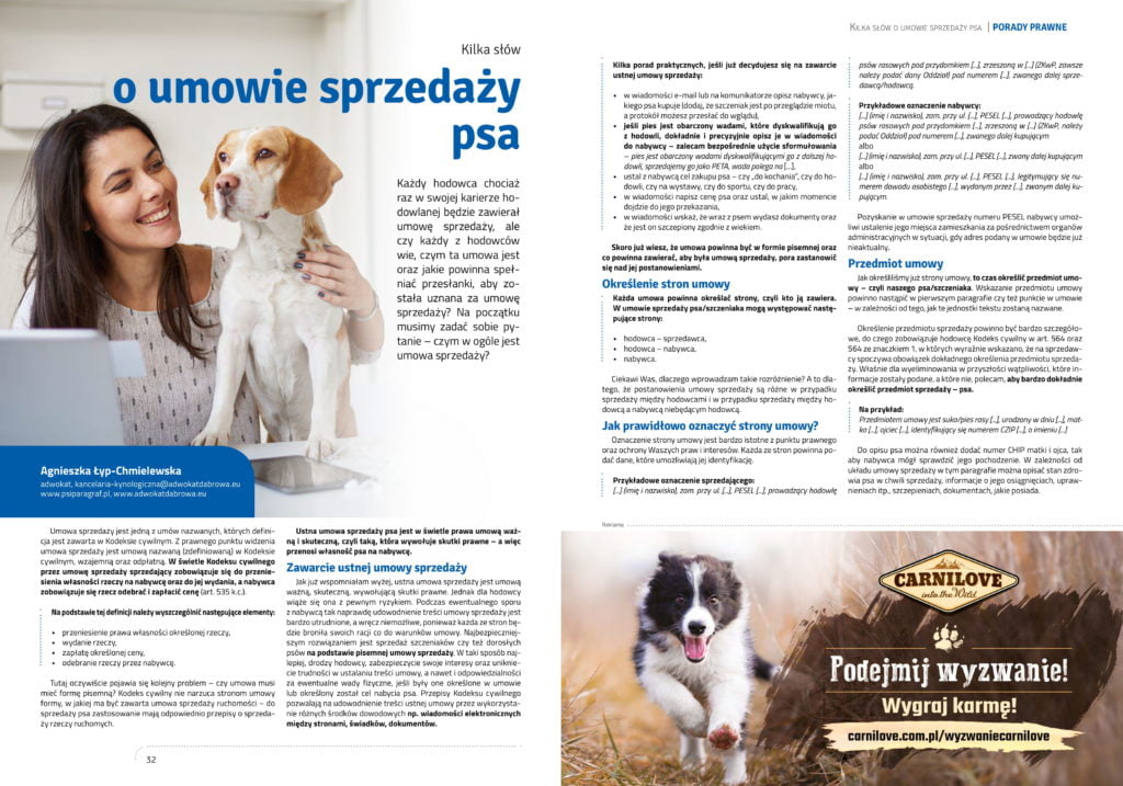W wydaniu na maj-czerwiec ukazał się mój pierwszy artykuł poświęcony umowie sprzedaży psa pt. Kilka słów o umowie sprzedaży.