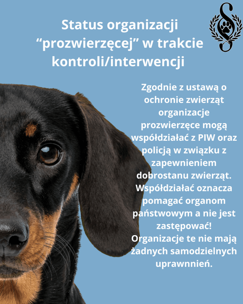 Ustawa o ochronie zwierząt przewiduje, że inspekcję weterynaryjną MOŻE WSPIERAĆ W DZIAŁANIACH organizacja społeczna, której celem statutowym jest ochrona zwierząt (fundacja, stowarzyszenie itp.). Wciąż jest to tylko i wyłącznie podmiot pomocniczy!