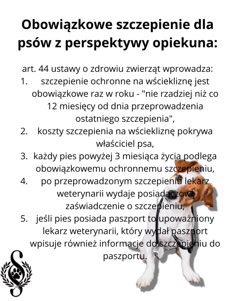- szczepienie ochronne na wściekliznę jest obowiązkowe raz w roku – „nie rzadziej niż co 12 miesięcy od dnia przeprowadzenia ostatniego szczepienia”,