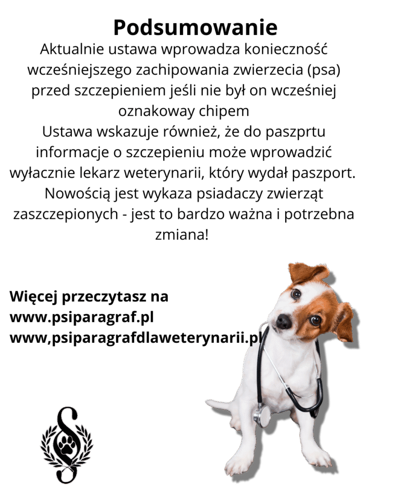 Zmiana jaka została dodana to potwierdzenie okoliczności, że potwierdzenie szczepienia przeciwko wściekliźnie do paszportu może wpisać tylko i wyłącznie lekarz weterynarii, który wydał ten paszport (art. 44 pkt 5).